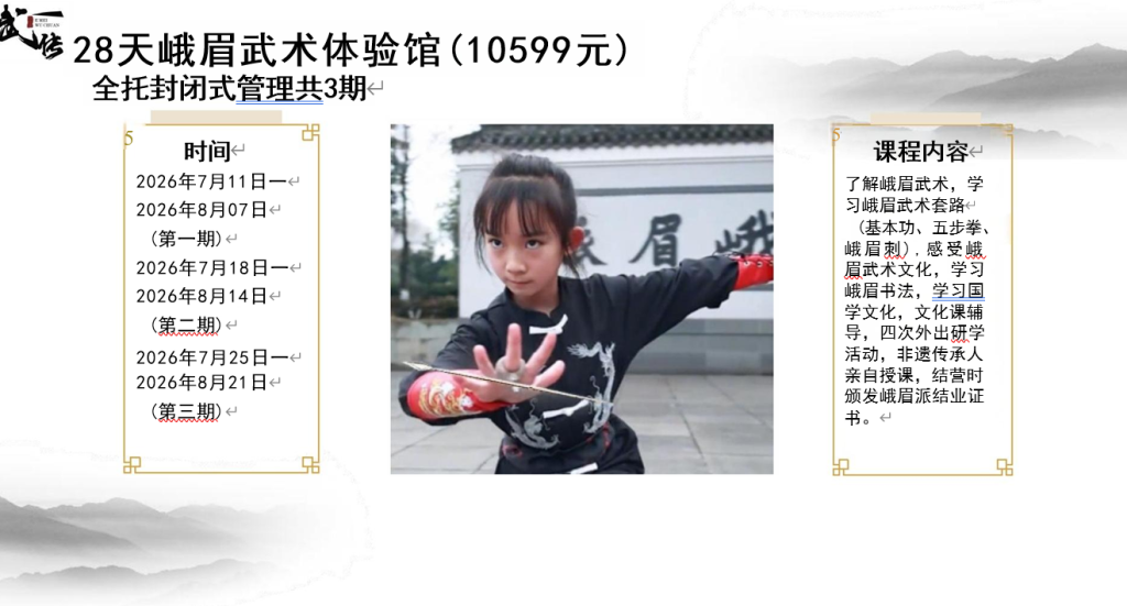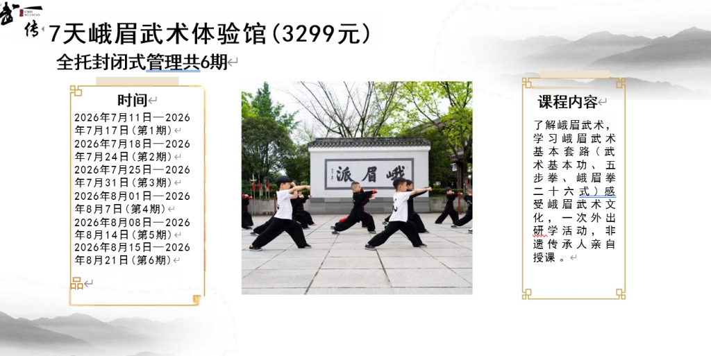 | 8:00-10:00 | 开营仪式 | 峨眉武术 | 峨眉武术 | 峨眉武术 | 峨眉武术 | 峨眉武术 | 峨眉武术 |